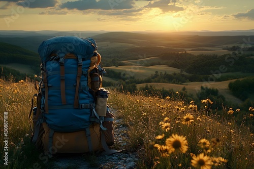 Backpacking Adventure at Sunset in Serene Countryside Landscape