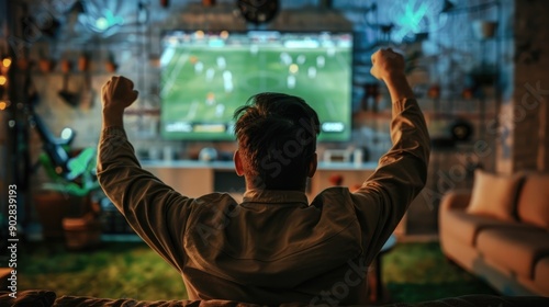Backview Photo of Man Watching Football at Home, Celebrating with Raised Hands