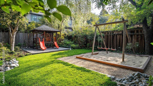 Backyard with sandbox, slide, and swings under a green canopy of trees.