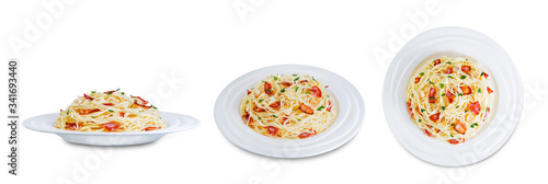 Bacon garlic parsley pasta on a white isolated background