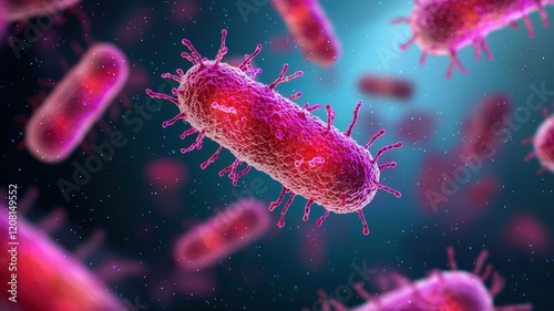 Bacteria Colony concept. Microscopic view of vibrant pink bacteria in a dark environment, showcasing their detailed structure.