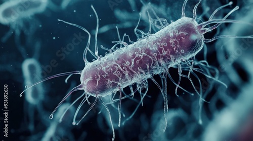 Bacterial flagella are seen rotating rapidly, allowing the microorganisms to swim through their aquatic habitat