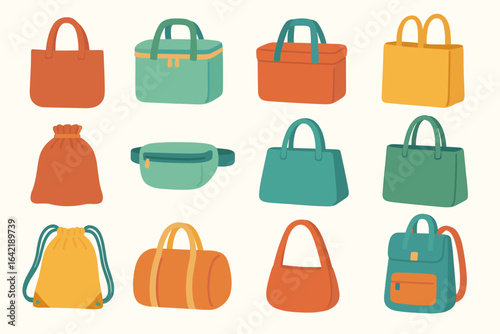 Bag and backpack flat icon set. stylish bags, packs, and travel accessories collection