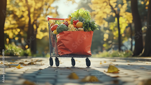 Bag full of groceries on wheels, the order is rushing to the customer, food delivery service