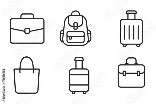 Bags line icon set. Briefcase, backpack, suitcase, luggage for travel and business. Vector outline pictograms for web design, apps, UI, UX. Shopping tote, baggage symbol.