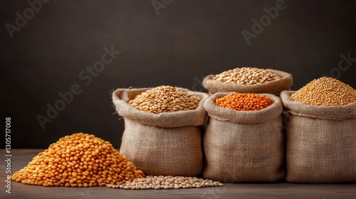 Bags of corn grains and kernels displayed on a table, showcasing agricultural produce.