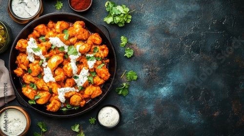 Baked chicken dish topped with creamy sauce herbs served in a black cast iron skillet on a rustic dark background