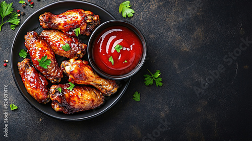 Baked chicken wings with barbecue sauce and basil on a black plate over a dark background. Plate of delicious barbecue chicken wings. Roast chicken wings BBQ. Fast food. Copy space area