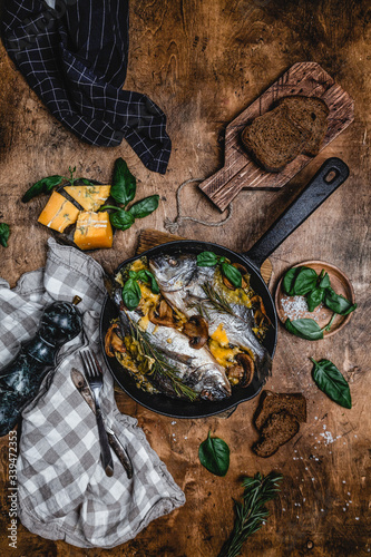 baked fish in cast iron skillet with mushrooms, herbs, cheese and spices on brown wooden background, nutritious dinner