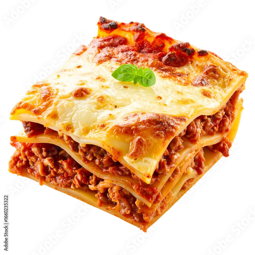 Baked lasagna slice with layers of cheese and sauce, isolated on white and transparent background