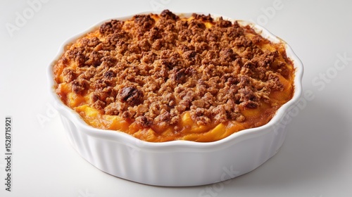 Baked Peach Crisp in White Dish on White Background