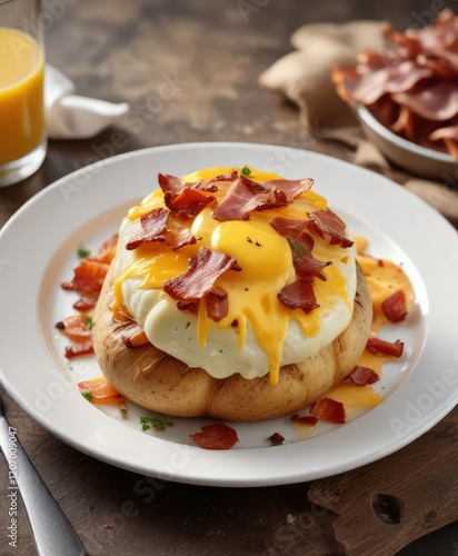 Baked swiss potato with melted cheddar cheese and chopped cooked bacon served on a white plate, bacon, potatoes