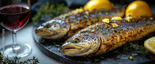 Baked trout with lemon and a glass of red wine, aesthetic image, text space