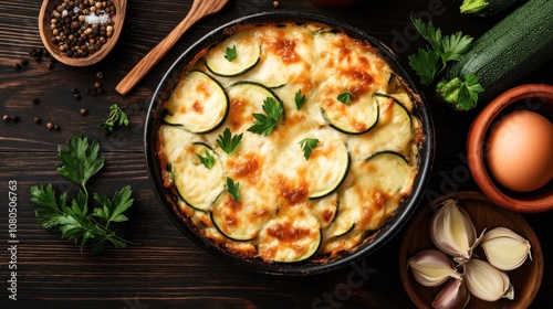 Baked zucchini casserole with melted cheese topped with parsley in a black dish surrounded by fresh ingredients such as zucchini, parsley, garlic, eggs, and peppercorns on a wooden table.