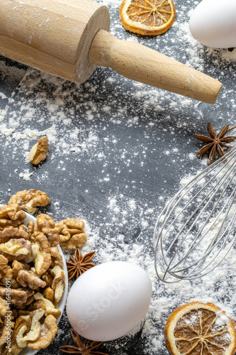 Bakery composition. Cooking food ingredients: flour, eggs, nut and star anise, orange on dark table kitchen background for cake. Top View Copy Space. Cookies Pie Or Cake Recipe Mockup.