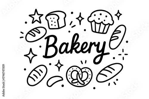 Bakery Doodle Art. Doodle bakery shop with stars, breads, and sparkles, center word “Bakery” in black and white isolated