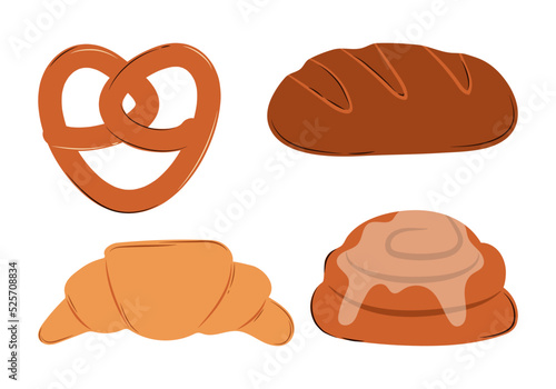 Bakery products: bread, croissant, pretzel, cinnamon roll vector flat Illustration. Fresh bread.