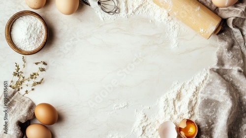 Baking background at light white stone table, flour and sugar and eggs and rolling pin and modern baking towel around the sides, top view with copy space