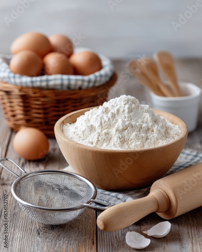 Baking essentials arranged on a wooden table with flour, eggs, and utensils for preparation in a cozy kitchen