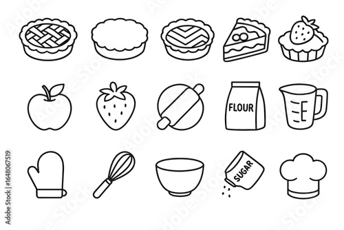 Baking essentials: pies, ingredients, and utensils in iconic line art style