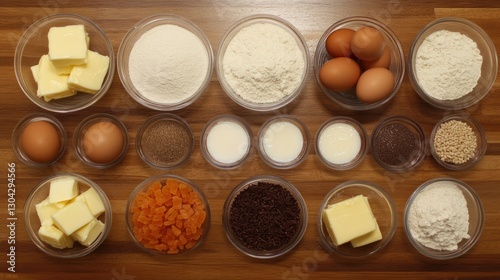 Baking Ingredients: A Flat Lay of Butter, Flour, Eggs, and More