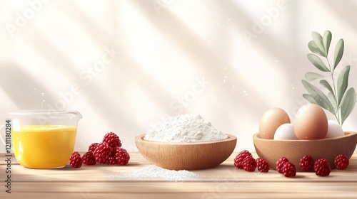Baking ingredients flour, eggs, raspberries, and batter.