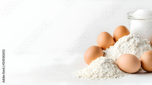 Baking ingredients flour, eggs, sugar. White background. Food preparation