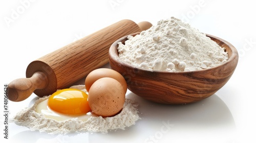 Baking ingredients flour in bowl with eggs and rolling pin over white background