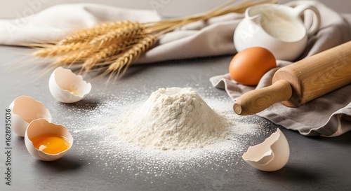 Baking ingredients including a pile of flour, cracked eggs, and a rolling pin on a dark tabletop.