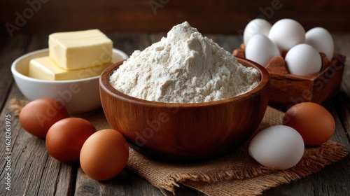 Baking ingredients including flour, eggs, and butter arranged neatly on a countertop in a well-lit kitchen setting