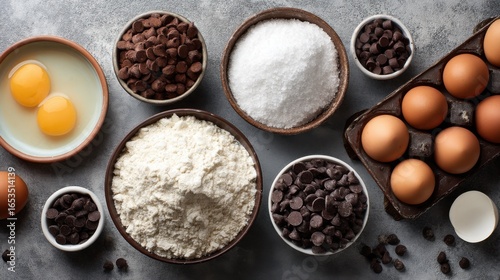 Baking Ingredients Still Life: Eggs, Flour, Sugar, and Chocolate Chips