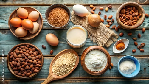 Baking Ingredients Still Life with Eggs Flour Sugar Milk and Argan Nuts on Wood
