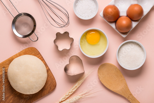 Baking or cooking background. Ingredients, kitchen items for baking.