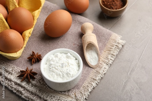Baking powder, anise stars, eggs and cocoa on grey textured table, closeup