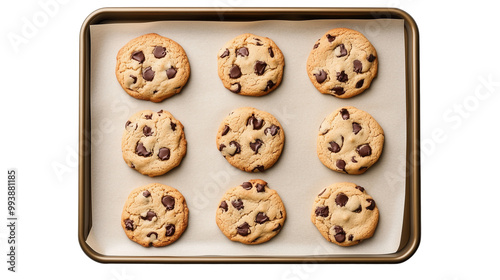 Baking sheet with chocolate chip cookies on parchment isolated on transparent background