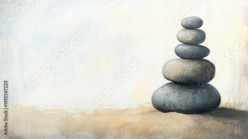 Balanced grey stones on beige sand against a light background