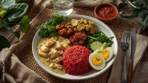 Balanced Meal on ceramic plate, nutritious portion of protein, vegetables, and whole grains presented in clean, modern style for healthy eating inspiration