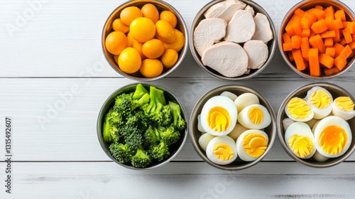 Balanced pet food with boiled eggs, turkey, and steamed vegetables, portioned in bowls