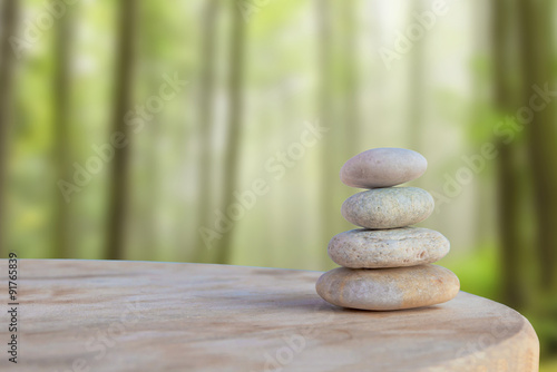 Balanced several Zen stones on blurred beautiful forest backgrou