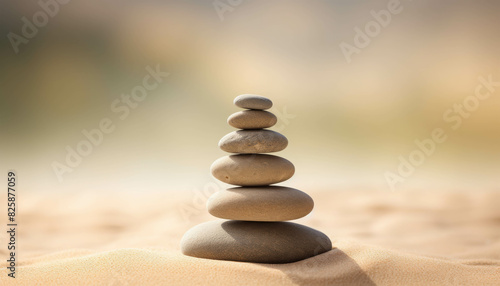 Balanced stack of smooth stones on sandy surface, representing tranquility and zen in a serene natural setting.