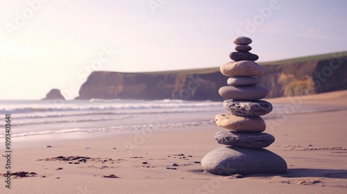 Balanced stone stack on sandy beach with gentle ocean waves and a scenic coastline in the background under a clear sky.