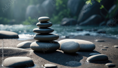 Balanced stones create a serene focal point beside a tranquil river during golden hour light