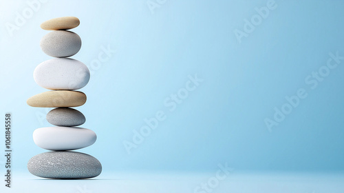 Balanced stones stacked on blue background, symbolizing harmony and tranquility. arrangement showcases various shapes and colors, creating serene atmosphere