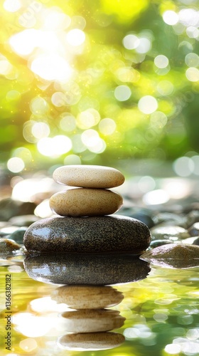 Balanced stones, tranquil stream, sunlit forest, serenity