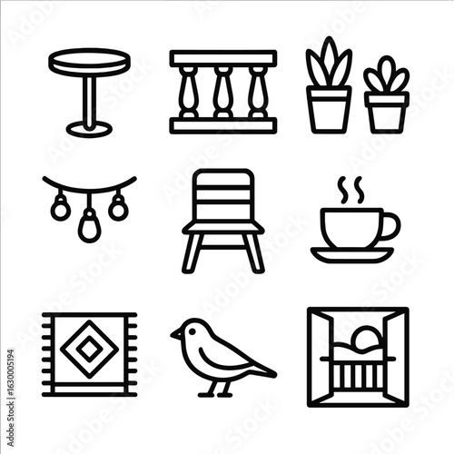 Balcony Living Icons. Outline icon set of balcony living: small table, balcony railing, potted plants, hanging lights, chair, cup