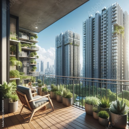 Balcony Oasis: Green Plants and Lounge Chairs Amidst Towering Buildings