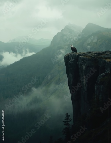 Bald eagle perched on rocky cliff surveys mist shrouded mountain forest. Bird of prey, majestic predator strength, freedom symbolism. Cloudy sky view outdoor natural landscape. Great nature footage.