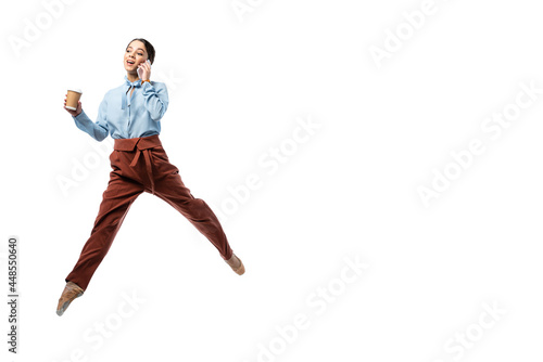 Ballerina with coffee to go talking on mobile phone and jumping isolated on white
