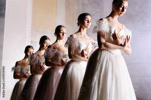 Ballerinas in dresses posing on scene