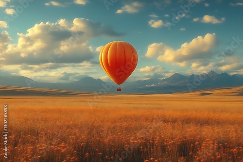 Balloon floats over field. Mountains backdrop